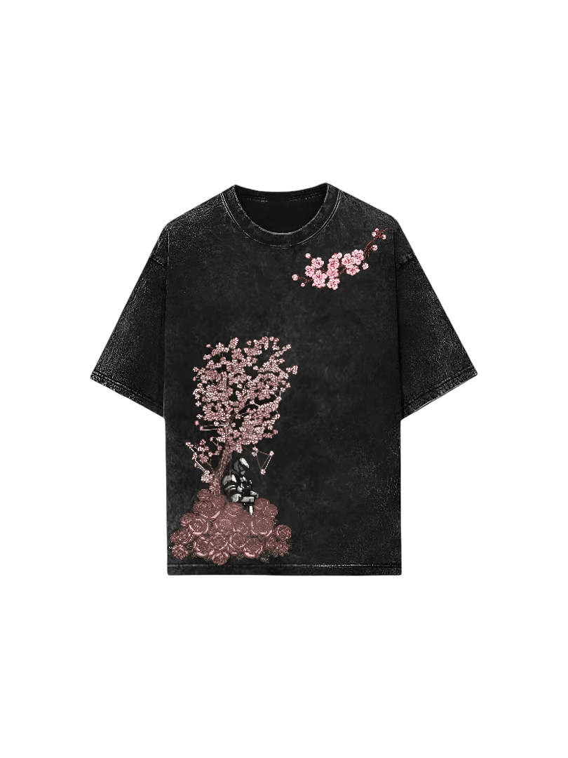 Crafted from premium acid-wash cotton fabric, this T-shirt offers a vintage look with a soft, breathable feel. The delicate pink blossoms contrast perfectly with the dark base, making this piece both elegant and bold.